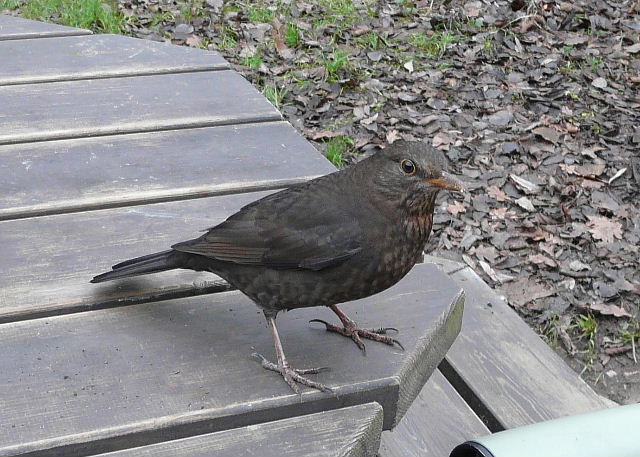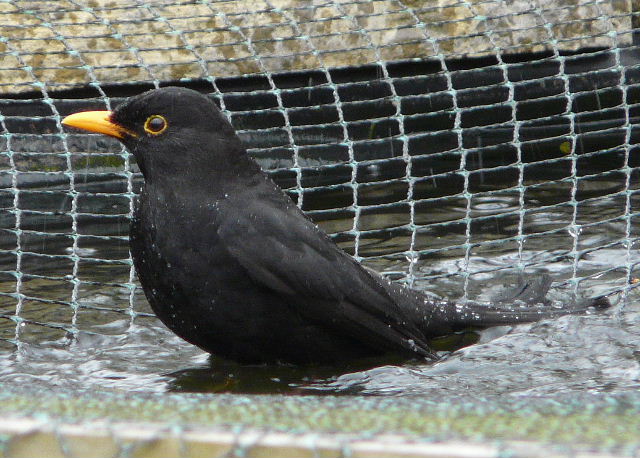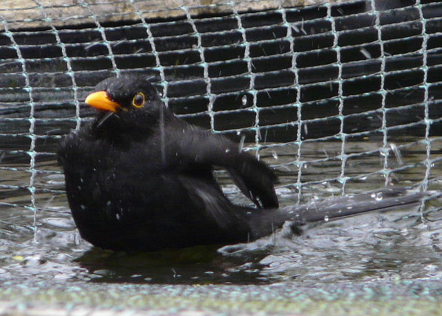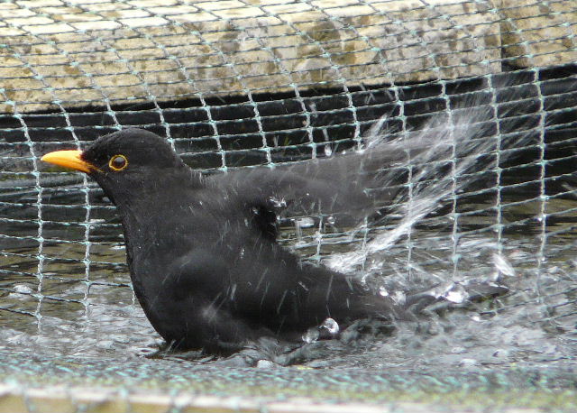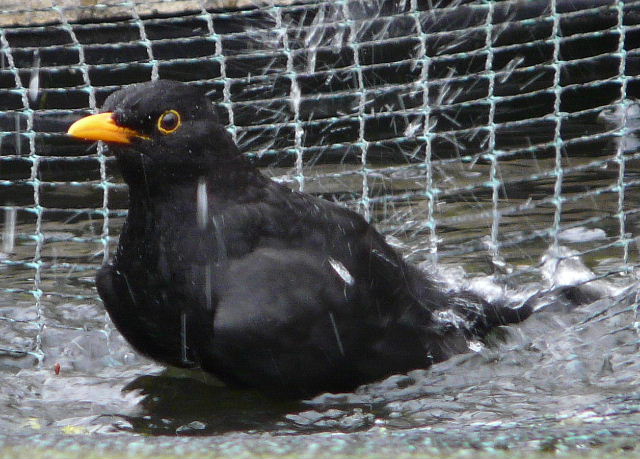 The following four photographs show a male Blackbird having a bath, using the netting over the goldfish pond in the garden here at Kensworth. All were taken on 08/03/08.