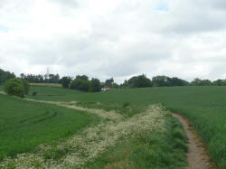 Across the footbridge, I spotted some Dovefoot Cranesbill. I soon turned right, along the edge of a huge corn field, initially with gardens to my left [2]. Where they ended, the path continued beside a wide ditch on my left [3], very gradually going uphill. The path was familiar to me, as it is part of the Chiltern Heritage Trail which I would be following for much of today’s walk. After a third of a mile or so, I turned right on a path that led to the start of a small embankment running through the corn field. The path continued to the right along the top of the embankment (though the map shows the right-of-way going along the bottom). After a few hundred yards I reached the end of the embankment, and at last came to the end of the huge cornfield and the top of the hill. I went through a gap in the hedgerow ahead of me, and continued into a large meadow. On reaching a massive pylon, where there were nice views ahead [4], I turned left through the hedge, and followed a fence on my left through a small meadow or paddock, where I met a man using a metal detector. The path continued on and down a farm drive to reach a road on the edge of Coleshill.