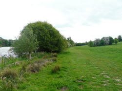 Where the gravel track turned left, the footpath carried on along the valley, now on a stony track beside the right-hand hedge of a long narrow valley. A man taking photographs here came over and asked, in a foreign accent, what was beyond the trees he could see ahead of him – he seemed disappointed when I told him it was the village of Little Missenden. The track carried on beyond a gate, now in what was obviously parkland [27], with some mature trees dotted about the grass. I noticed a large amount of the dark blue Germander Speedwell growing here. The sun came out very briefly around this time, and for a few minutes I walked in bright sunshine for the only time today. The stony track eventually turned left to go uphill, but I continued ahead on a path through the grass. The path continued along the valley, edging closer to the river on my right. Soon the river opened out into a small lake where it had been dammed [28] - obviously for the benefit of the owners of Shardeloes, the grand white house on top of the hillside to my right. There were Tufted Ducks and Coots on the lake.