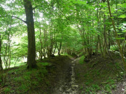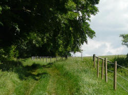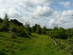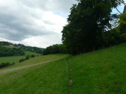| [1] The path descending towards the Oxfordshire Plain | [2]> Looking back from near the bottom of the hill | [3] The path along the foot of the Chiltern escarpment |