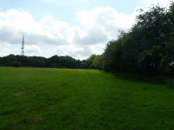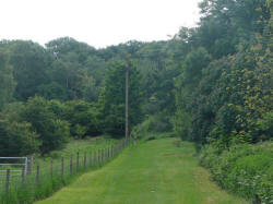 The path now continued for some distance through the wood [20], very gradually descending into a small valley on my left. When it reached the valley bottom, it turned left up the opposite slope, with the fence of a field close by on my left. This was a steep but short section, soon emerging on a lane or drive in another part of Ibstone. I went a few yards to the right, to where the large grassy expanse of Ibstone Common started on the left, and turned left on a bridleway. This runs along a drive between the common and garden hedges on the left, then passes through a small area of trees and crosses another drive, before following a hedgerow beside the common on the right. I took a short detour here across the common, to eat my sandwiches on a bench beside the village cricket pitch.