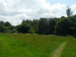 I walked through the car park, parallel to the road on my right, and continued on a path through the trees that soon joined the road. I followed the road for a few yards, then took a footpath on the right, just past the end of a belt of trees. The path went diagonally across a large cattle pasture, heading for the left end of a row of tall conifers. Some young bullocks over to the left stared at me as I went by – most of them were lying on the ground, which is meant to be a sign of impending rain, but it was a nice bright morning. The path then went downhill through a small area of wood to a kissing-gate.