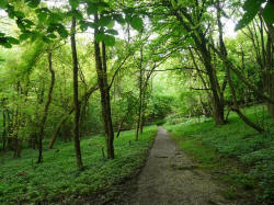 | [28] Looking back from the path to Cowleaze Wood | [29] The path through Cowleaze Wood | [30]Remains of an artwork in Cowleaze Wood |