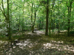 I returned to the bridleway along the edge of the common [21], noticing the large stone in the middle of the common (I’ve not been able to find anything out about it, but I don’t think it’s the original boundary stone that gives the village its name). Where the edge of the common curved to the right, I went straight on into a wood. Within yards I reached a path junction, where I turned left onto a bridleway. A notice announced that I was entering the Wormsley estate, and the bridleway descended quite steeply through the wood, the path being a very narrow chalk gulley [22]. Initially I was on the Chiltern Way again, but about halfway down the hill this forked left onto a footpath (I remember missing this junction once!). The bridleway curved right, and emerged from the wood near the bottom of the slope [23], continuing on a good track along the bottom of a broad valley.