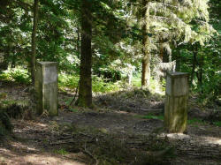 I went through a gate and entered Cowleaze Wood. Almost immediately I met a woman coming the other way with a St Bernard dog (I’d see her again later, along the road just after I’d started my drive home). There was clear evidence that there really was forestry work going on here, with branches and logs left lying on the ground amongst the conifers. I followed the path [29] through the wood, looking out for the sculptures that are located here. Or at least they were – I went past one, which consisted of two triangular cement columns. I was sure that when I first went past here (last October, on one of my exploratory walks) there were some images on each of the sides of the columns, but now they had gone – I could see the rectangular spaces where they’d been [30]. I wondered whether the images have been stolen or vandalised, or just temporarily removed for protection while the forestry work is carried out (in fact I’ve just checked on the internet, and the sculptures have been removed due to a lack of funding!). It was a straightforward half-mile walk through the wood and I was back to the closed car park and my car parked on the road.
