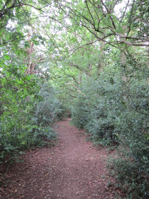 After only a hundred yards or so, I turned left down another bridleway, which ran between a hedge on my right and a wooden fence, beyond which was a large corn field. After the corn field, the bridleway ran between overhanging hedges and gradually dropped downhill into the Chess Valley.