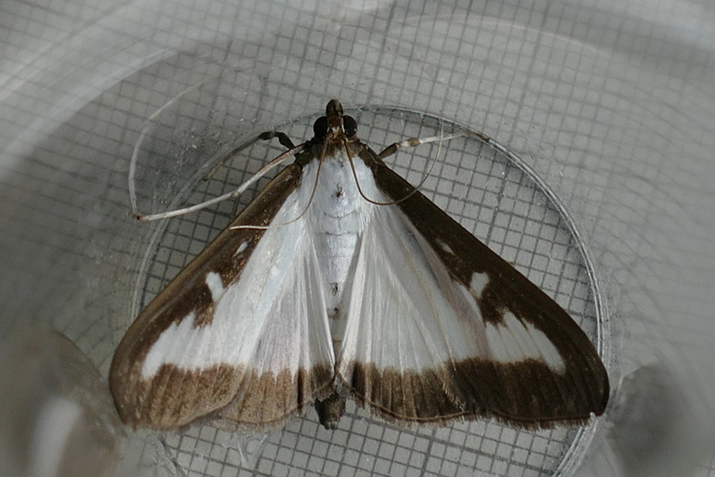 This is an Asian moth that was accidentally introduced to the UK, first recorded in Kent in 2007. It has now spread through much of the south of the UK. Its caterpillars can seriously disfigure box trees by removing large numbers of their leaves, sometimes leaving them completely bare, and it is considered a serious pest in parts of Europe.