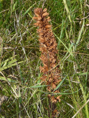 Broomrape has no greenery of its own, getting its nourishment by tapping into the roots of other plants. There are different types of Broomrape, named after the host plant, e.g. Ivy Broomrape is a parasite of Ivy. The three shown here are most probably Common Broomrape, the fourth photo is possibly Knapweed Broomrape.