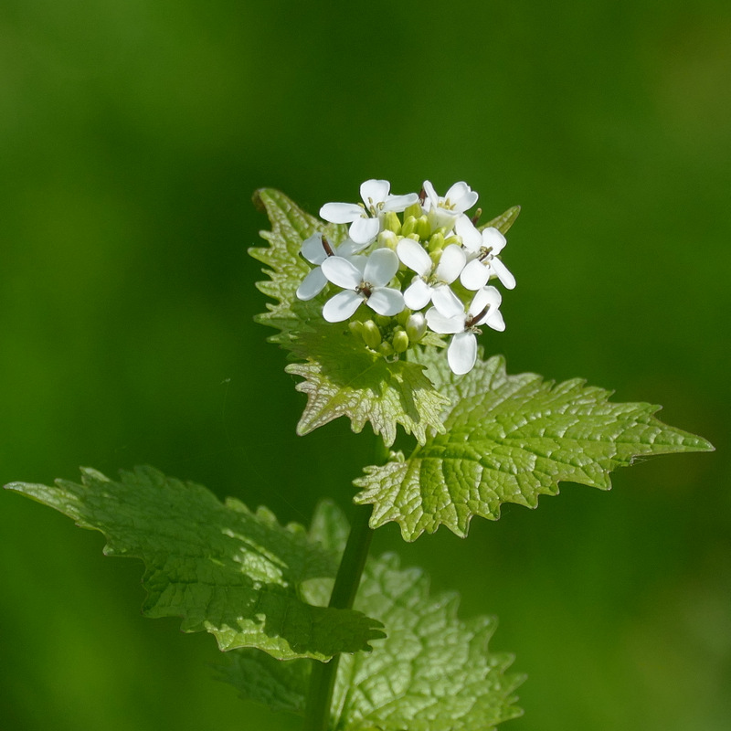 This very common member of the cabbage family grows in hedges and damp woodlands, flowering from mid-April until August. It is also known as Jack By The Hedge. The leaves smell strongly of when crushed.