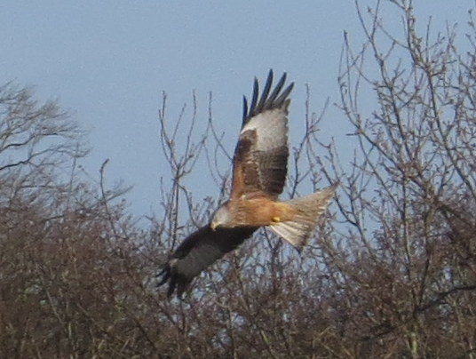 I turned right to follow the edge of the field, with a nice view to my left over a series of wooded hills (unfortunately I was looking almost straight into the sun on this part of the walk and had difficulty getting any decent photographs). The path then went through a short bit of woodland (I went straight on when another path went left at a junction) to emerge in another field. Here I immediately spotted three Fallow bucks and managed to take a few photos before they ran off. As I walked downhill along the edge of the field, with the wood on my right, I spotted a group of about 15 female Fallow deer in the trees.
