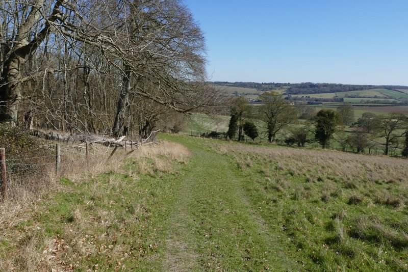 Across the road I continued down the long drive to Ward's Hurst Farm. I turned left as soon as I reached the farmyard, then right to walk through the farmyard in the same direction as I'd been on along the drive. I went straight on where another path crossed in the farmyard, and followed the path gradually downhill through empty sheep pastures, soon with attractive beech trees on an embankment on my left. I looked out for Primroses on this embankment as I remembered see them here before, and soon saw quite a number of them. This path one of my favourite local paths (at least going this way), because of the fine views ahead to the Dunstable and Whipsnade Downs and what becomes the Gade Valley.