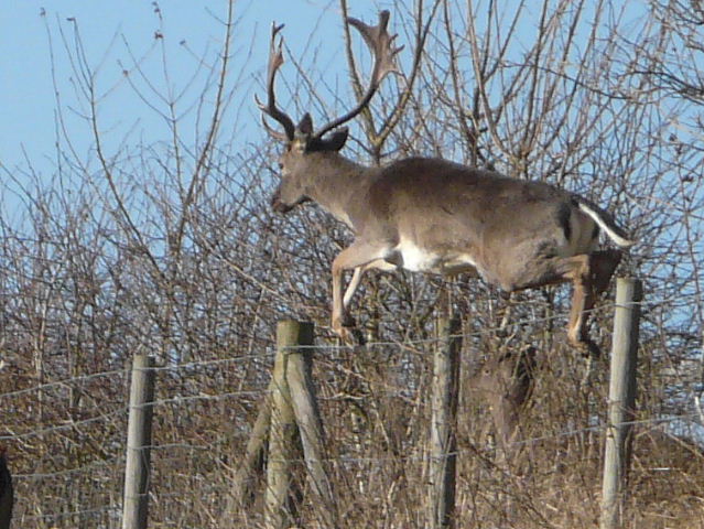 A Fallow Buck leaping the fence