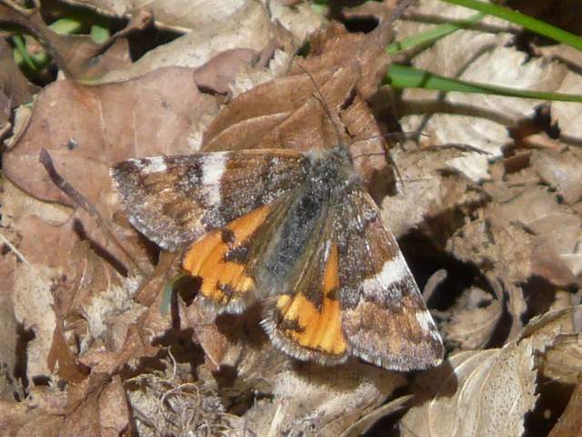 The path almost immediately forked slightly right from a track going on ahead, then at a path junction I turned right. After having my lunch sat on a convenient log, I continued south-eastwards along this path until I reached another bend in Bottom Lane. Here the path continued round two sides of a paddock and passed through a stable yard, continuing north-eastwards just inside another part of Hodgemoor Woods. Here I was lucky enough to see and photograph an Orange Underwing moth, only the second one I've identified (the first was on the edge of Hangar Wood near Fingest).