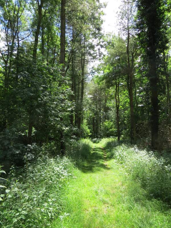 Where the street went left, I went straight on, along the drive to Coopers Court Farm. After passing under the M40 for the second time today, I turned left along a track heading away from the farm and down a small valley. After maybe a quarter of a mile, where the track went slightly left, I went straight on along a headland between corn fields. A waymark seemed to show the path staying on the track, but I was following the route on the OS map and it's definitely the way the path used to go - but I'd have been better off on the track, as for much of the path the headland was covered in nettles and my legs were squeezed between the corn on the left and the nettles on my right. The path then entered Penley Wood, continuing along the valley bottom as it curved left and then right.