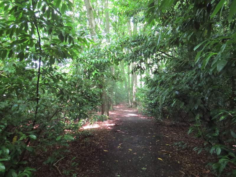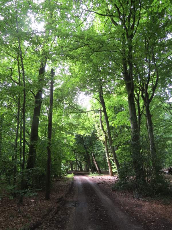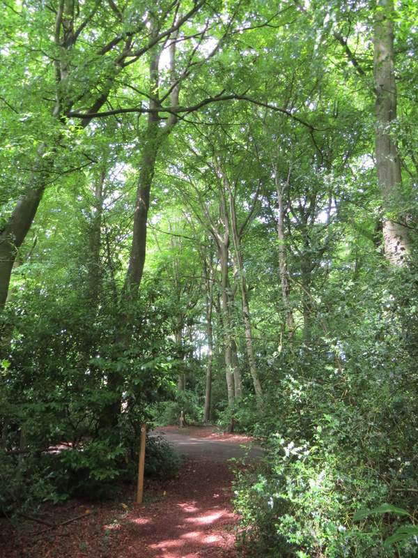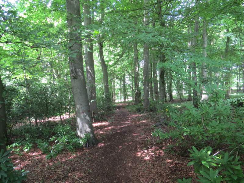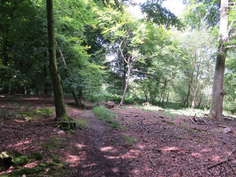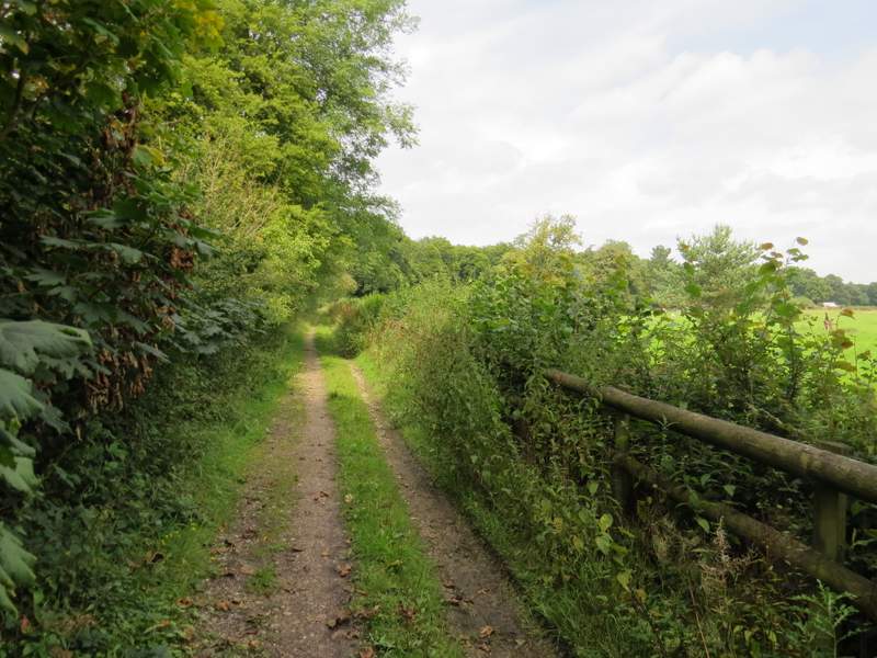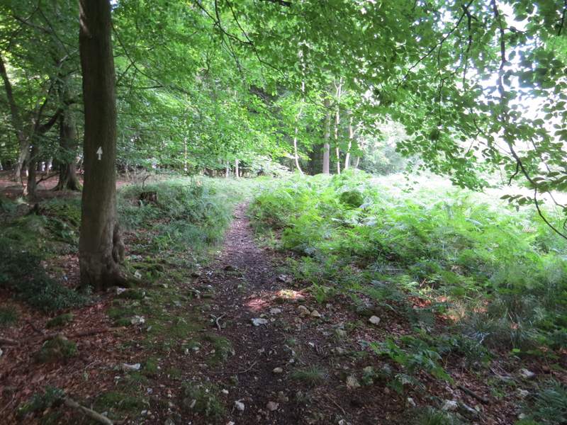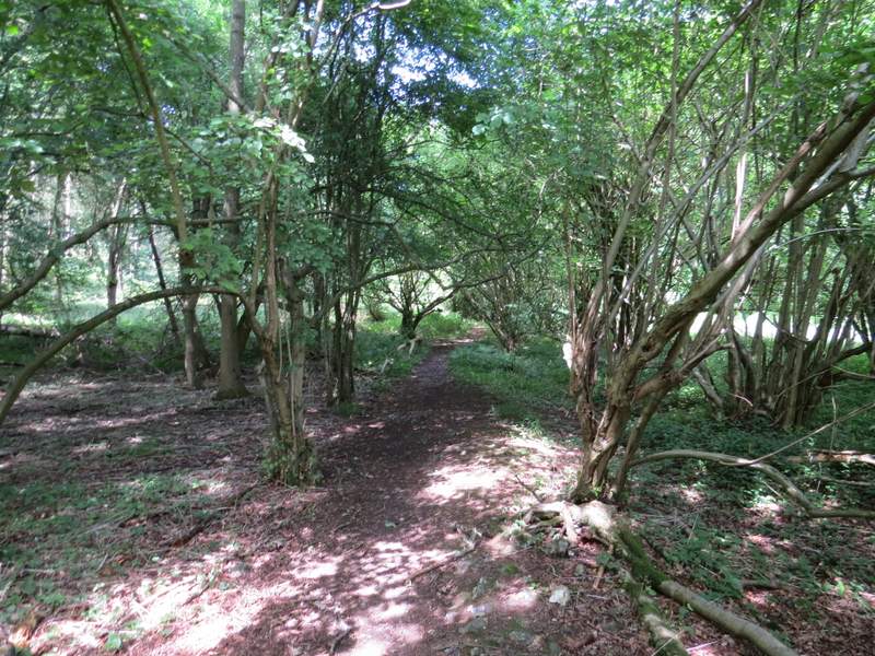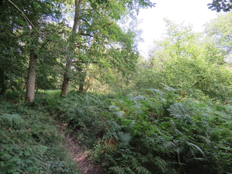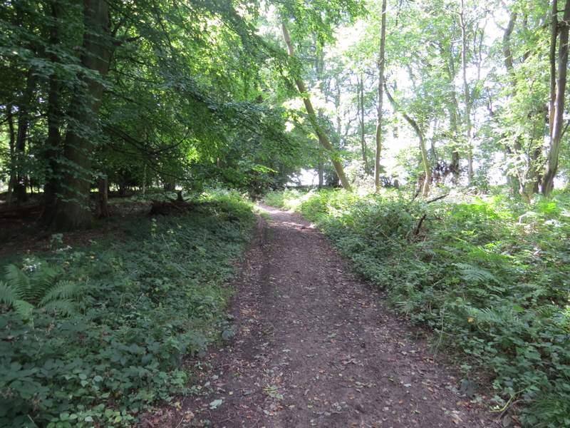 In the valley bottom the footpath entered Nott Wood, and bore half-right, roughly northwards. After about a third of a mile through the wood, the path met a track where it went left. It then soon came to a T-junction with a surfaced drive, just inside an edge of the wood.