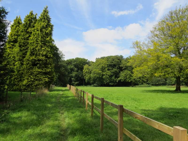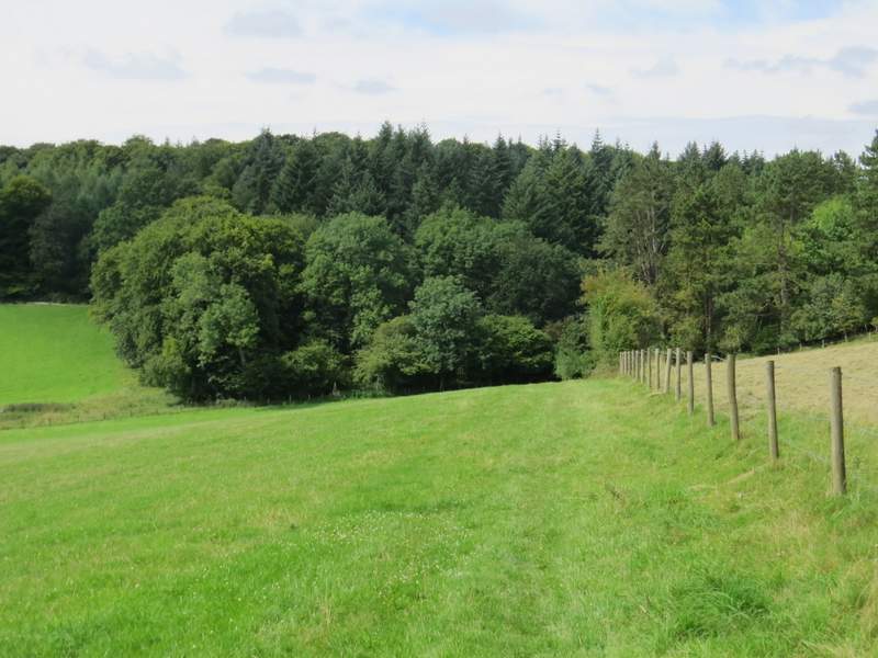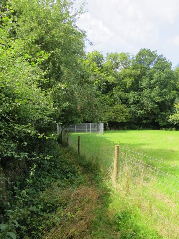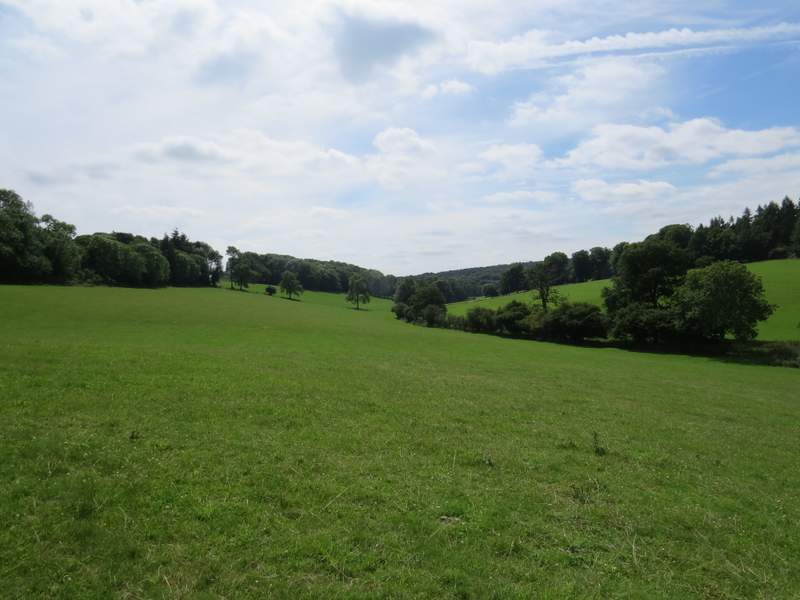 Eventually the bridleway left the wood, soon passing a cottage on the left and then reaching a crossroads of tracks or drives where I turned left (leaving the route I'd followed in April 2015) and soon reached the road through Highmoor. I went a few yards right then took a path starting on the other side, initially along a drive and then passing to the right of a property. I soon reached a path crossroads, where I turned right onto what was one of only two new paths for me on this route (actually I'd walked the first section of this one once before, by mistake!). The path ran through a narrow wood, passing a few properties and crossing a drive or private road at one point. On leaving the wood, the path followed a paddock fence on the right - beyond it, on the far side of a meadow I saw two Fallow deer, the "pale brown with white spots" variety which I don't see very often at all. The path then passed through another small wood, before dropping downhill along the right edge of a grassy field with a nice view along the valley to my left.