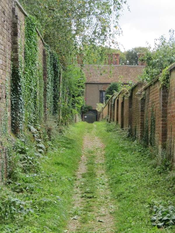 Approaching Chenies, between the walls of Chenies church (left) and Chenies Manor