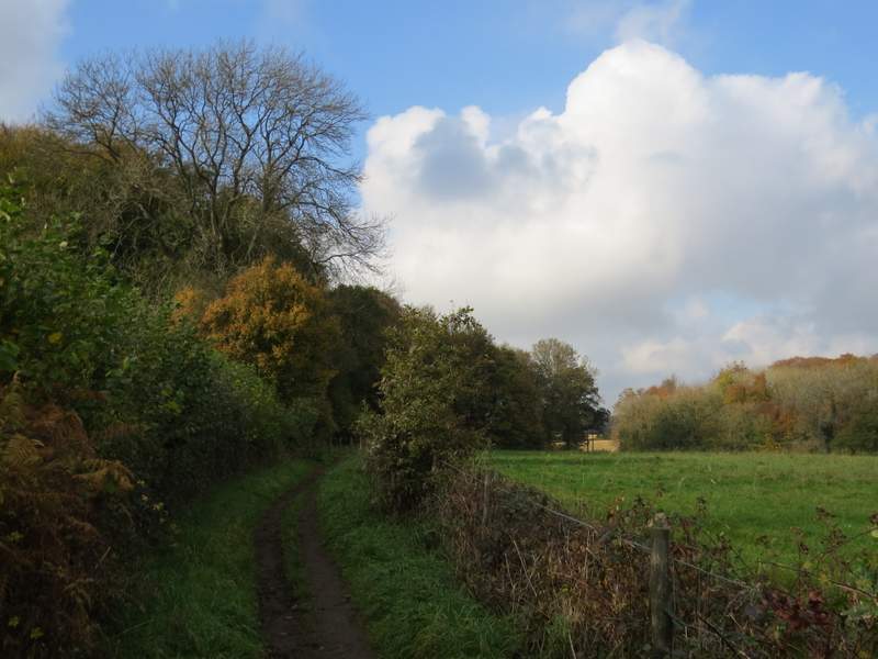 I followed the lane through the village, initially with the sports field on my left. Just after the tiny St Mary's church in a garden on the right, the lane ended but a bridleway went straight on, initially between hedgerows of tall trees. The bridleway then continued between a hedge and a fence on my right, the hedge soon giving way to a wood on my left. Soon after that wood ended I had a wood on my right, with flat stubble fields over the hedge that was now on my left. Shortly after reaching the end of this second wood, I reached the end of a roughly surfaced track. The bridleway followed the track a short distance to the hamlet of Ballinger Bottom, where the track became a lane (the OS map shows it as an 'other route with public access') that after a few hundred yards brought me into the village of The Lee, almost opposite the Cock and Rabbit pub. I turned right and went the short distance to the war memorial on the Green.
