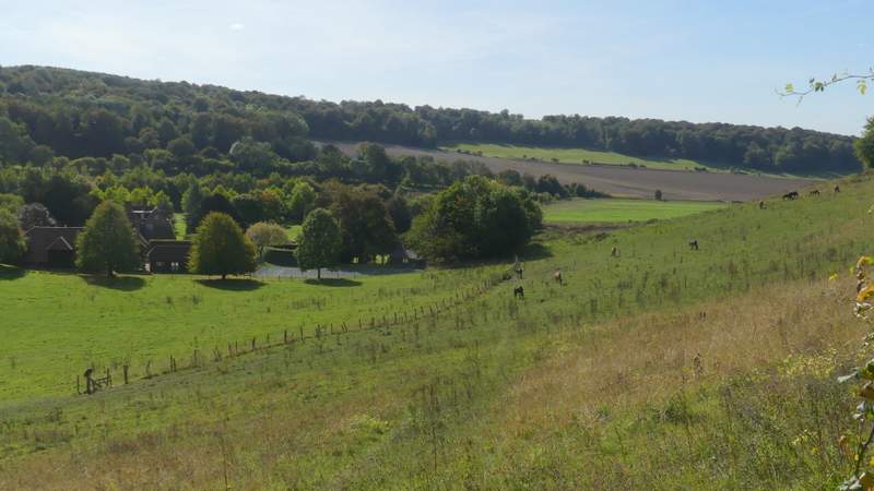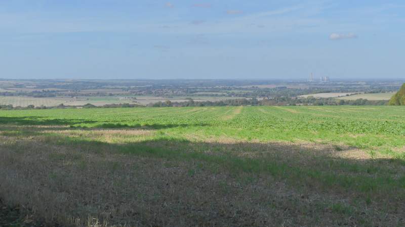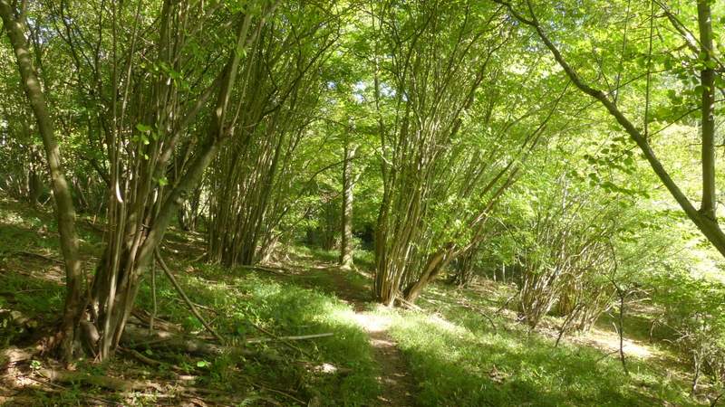 I followed Garsons Lane past Garsons Farm on my right, and then a view opened out ahead of me over the Oxfordshire Plain. I then took a byway (Braziers Lane) forking left into a wood. I went straight on where one path went left, then after another quarter of a mile or so through the wood (close to a field corner on my right) I took a path going sharp left, going gently downhill just inside an edge of the wood. On reaching a path junction I took a quick detour, going down some steps on my right to a gate where I took a photo of the view over Bottom Farm, before going back up the steps and continuing on my way.