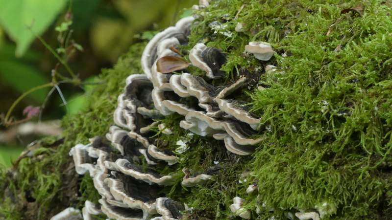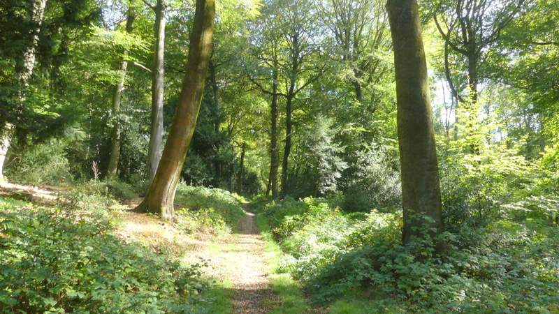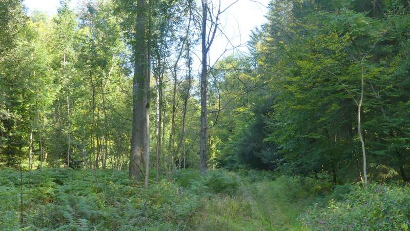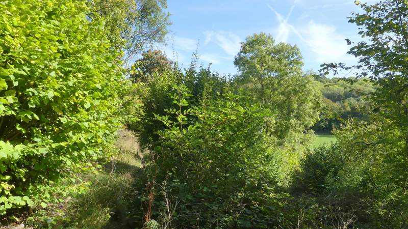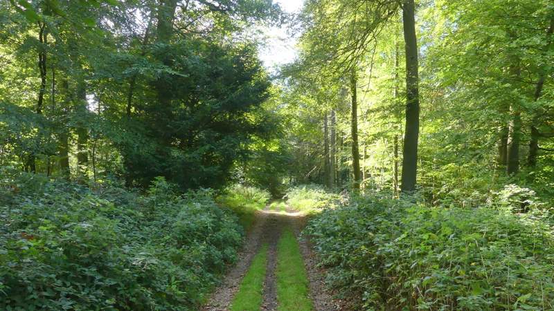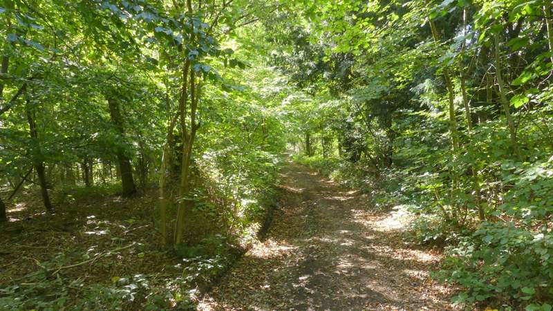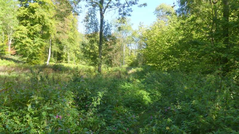 At the bottom of the slope (where another path went right) I continued along a valley bottom, the wood here being named Braziers Common on the OS map. I was dismayed to see that the wood was infested with Himalaya Balsam, a pretty pink flower that is non-native and very invasive - it was clearly taking over much of the woodland floor at the expense of native plants. The path along the valley seemed narrower and more overgrown than I remembered. When I eventually reached a path crossroads (having passed a junction where a path came in on the left) I turned right, following this path gently uphill through the wood. I kept left at a junction where the path forked, and soon after finally left the woods, following a track past some cottages to reach a lane almost opposite Scott's Farm.