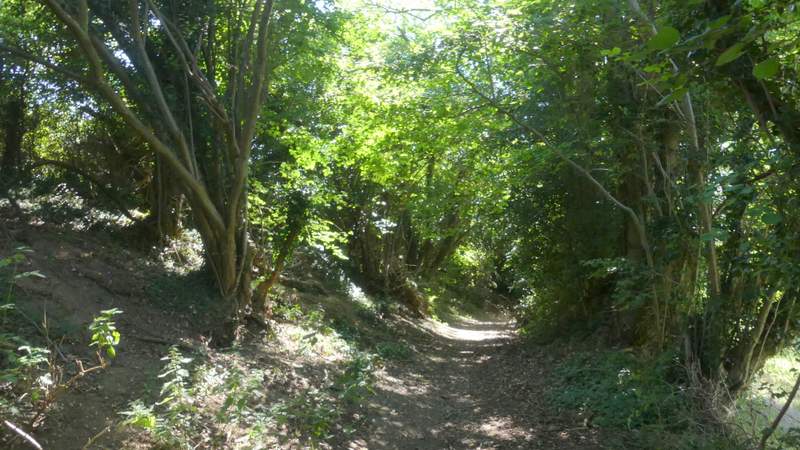 After only a hundred yards or so, I turned left down another bridleway, which ran between a hedge on my right and a wooden fence, beyond which was a large corn field. After the corn field, the bridleway ran between overhanging hedges and gradually dropped downhill into the Chess Valley.