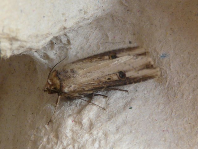 This is a common moth throughout the UK, flying between June and July. It rests with its wings tightly wrapped around its body.
